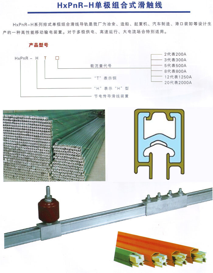 HXPnR- H系列單極組合式滑觸線由H型鋁合金本體導(dǎo)軌加壓V型不銹鋼滑接帶、PVC絕緣外殼、外置式集電器以及懸吊、固定等組件組合而成。該產(chǎn)品以其設(shè)計(jì)新穎、結(jié)構(gòu)合理、維護(hù)方便、使用安全等特點(diǎn)被廣泛應(yīng)用于電流較大、使用頻率較高、運(yùn)行速度快和環(huán)境較差的場(chǎng)合。 |